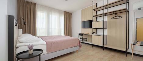The studio is designed for four people and is perfect for couples, families with children, and small groups. The interior comprises a hallway, a living area with a separate bedroom, and a bathroom. The lounge area features a comfortable double bed and a sofa bed. The kitchenette allows guests to prepare their own meals. Guests have access to two TVs, air conditioning, high-speed Wi-Fi, and a parking space in the garage.