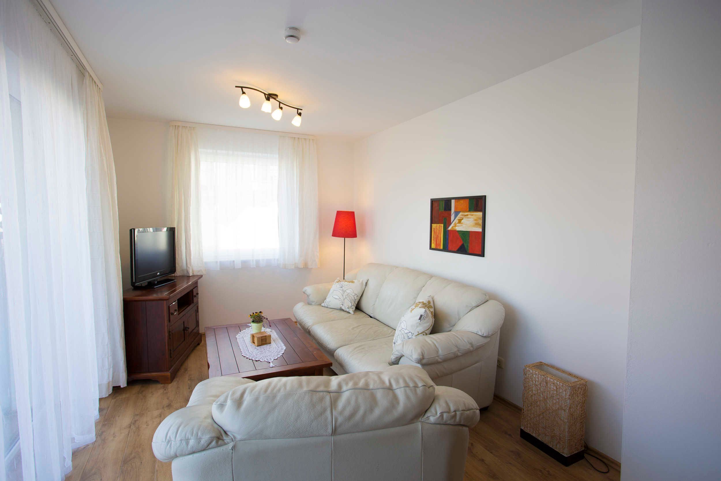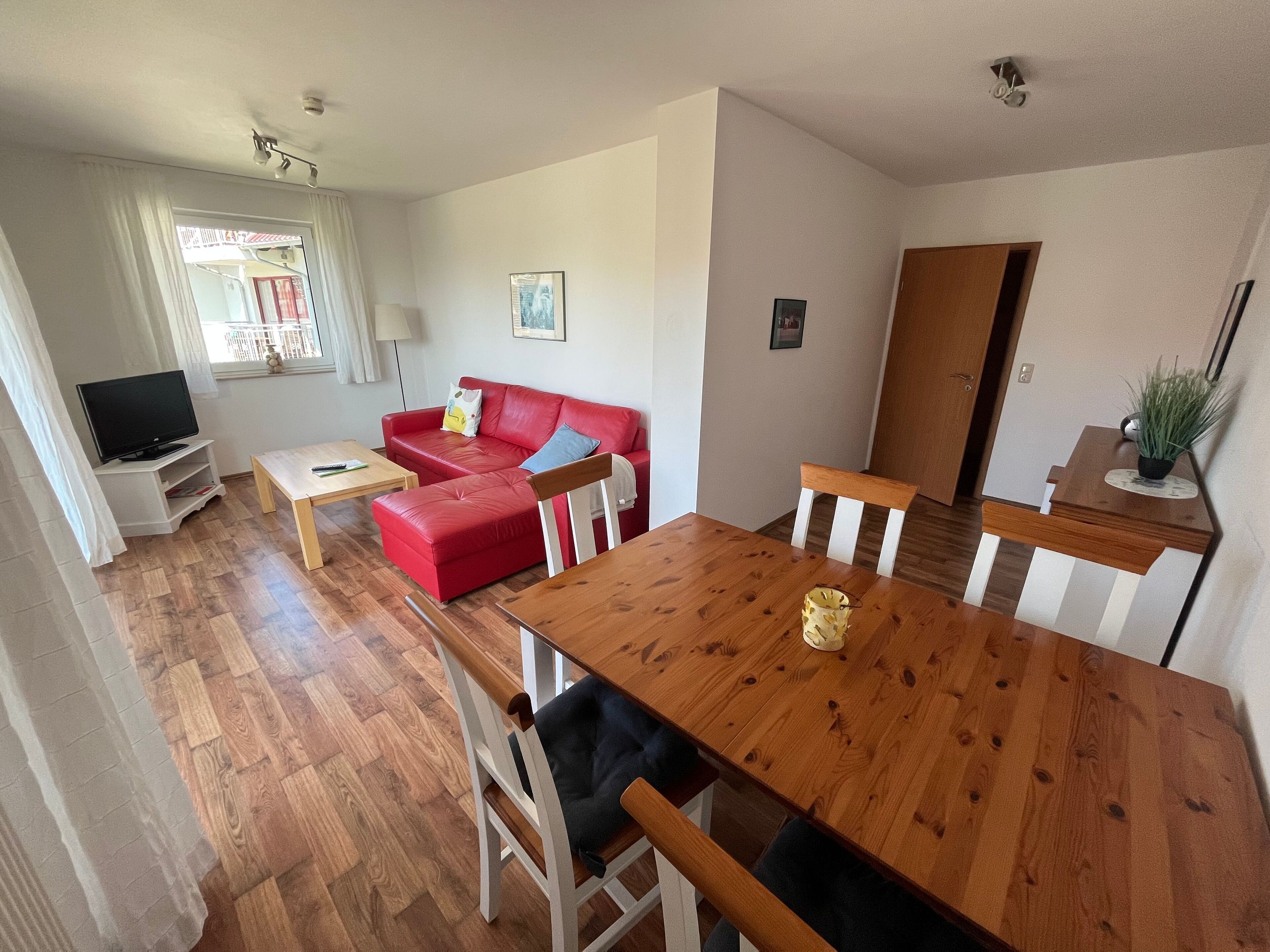 The apartment Wiek in the house Boddenblick is located in an idyllic, quiet location in a built in 2009 comfort cottage in Wiek am Bodden. From the terrace or from the balcony almost all apartments have the view of the water, partly to the island Hiddensee.   Villa Boddenblick houses 9 comfortable non-smoking apartments in Wiek. All apartments have a private bathroom, a flat-screen TV, free internet access (W-LAN) and a large terrace or Balcony window and garden furniture. They are modern and individually decorated in warm colors and with solid wood furniture. The apartment Wiek is cared for daily by a co-worker.   All bedrooms in Haus Boddenblick feature 21 cm thick 7-zone luxury tons of pocket spring mattresses. A playground at the neighboring house Wittow is available to all guests. On site you can also borrow a high chair, a cot or the grill at the landlord for free. For a small fee you can use the shared dryer or the washing machine in the house. There is a shelter for your bikes. Each apartment has a parking space.   Both the harbor and shopping facilities are just a few minutes' walk away from the Ferienwohnung RĂŒgen. In Wiek there is also a cafĂ©, several shops, a flower shop, a bakery and a pastry shop. There is also a bank and several restaurants. The uniquely beautiful landscape, surrounded by Baltic Sea and Bodden, with cliffs, dunes and fine sand sandy beach can be enjoyed in every season. Leave the hectic pace of everyday life behind and treat yourself to a breath of fresh and healthy air. Or make yourself comfortable over a cup of tea and enjoy the sunsets from the balcony overlooking the water. We warmly welcome you and gladly help you with further holiday planning on site.