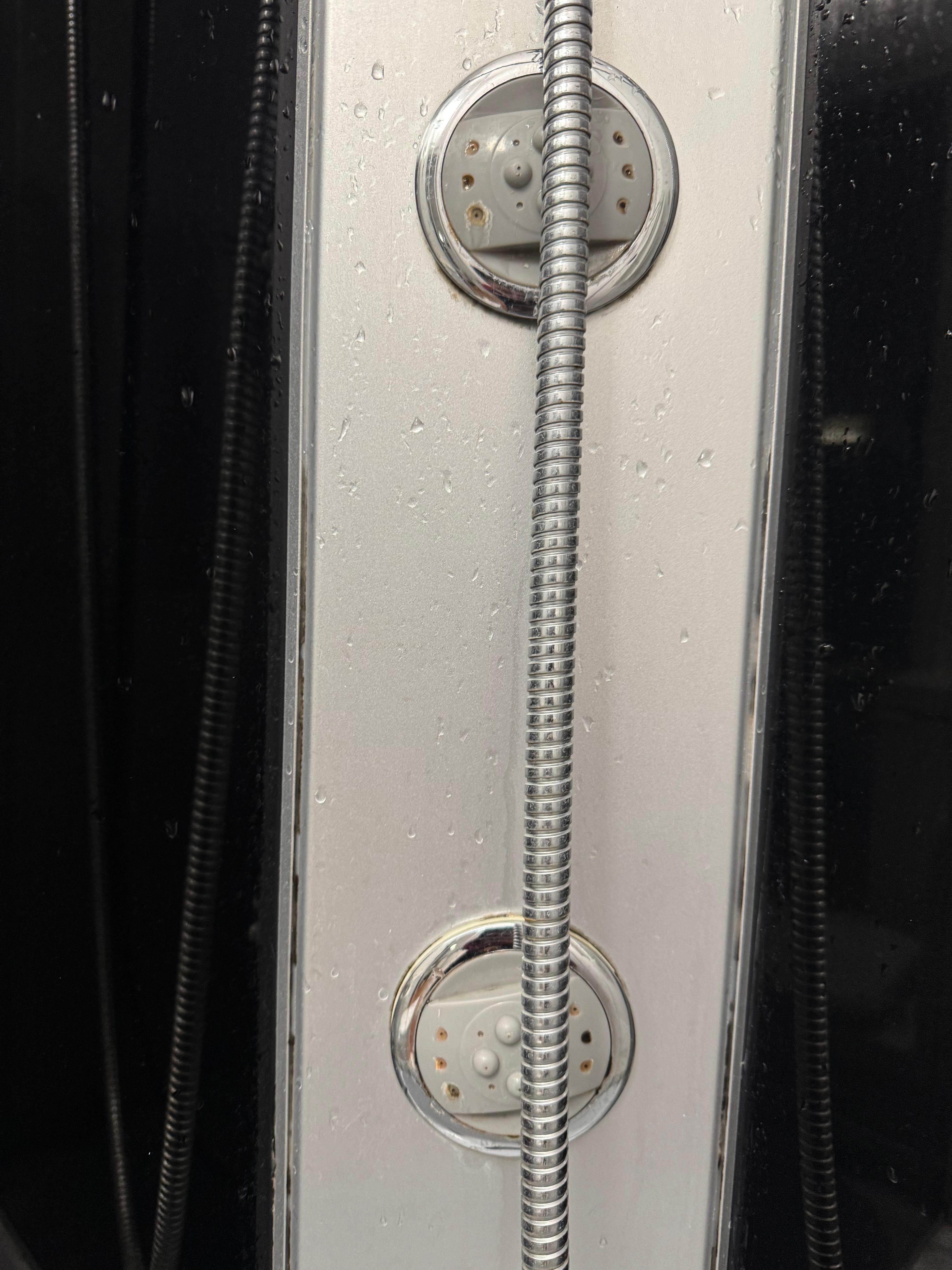 Shower, toilet, sink, mirror, towels, hair dryer
