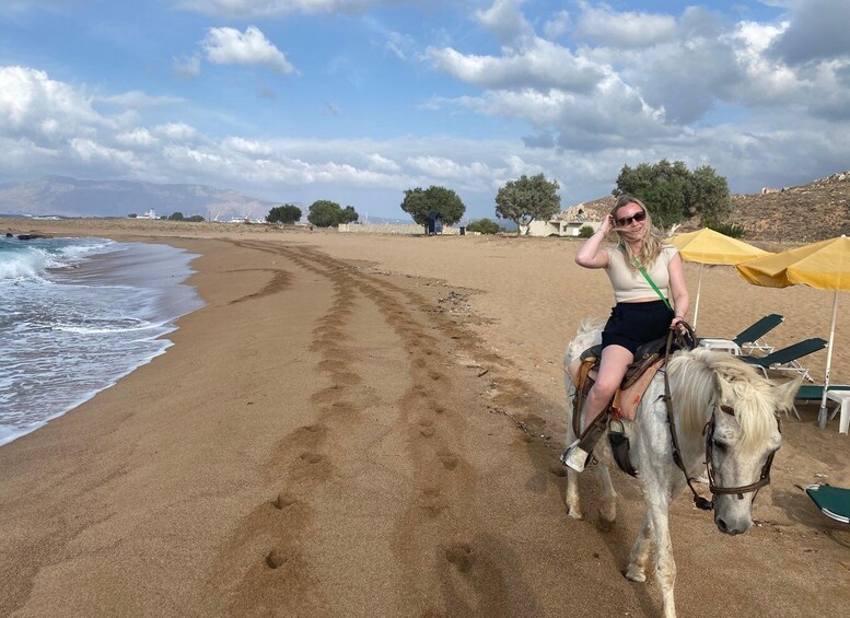 After we make arrangements regarding our meeting point, we will drive to Kissamos where we will meet my friend and owner of the beautiful and trained horses. We will offer you a unique and amazing horse riding experience for one hour next to the sea.