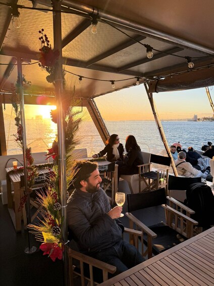 Take a seat on the boat's terrace or lounge as the boat takes off on the water. Stretch out and relax on one of the catamaran's 2 nets while enjoying your drink. Snap pictures of the unique architecture of the Electricity Museum and enjoy the colours of the sunset reflected on the water.