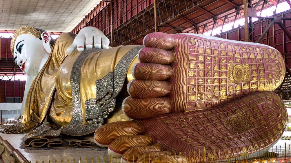 Next, stroll along a vibrant local market to experience Burmese culture before you stop for refreshments at the Victorian-style Strand Hotel. Then visit the Kyaukhtatgyi Pagoda, a 230 foot (70 m) long reclining Buddha, and wonder at its many colours. While here, check out the soles of the pagoda's feet, which have been decorated with 108 auspicious carvings of the image of Buddha.
